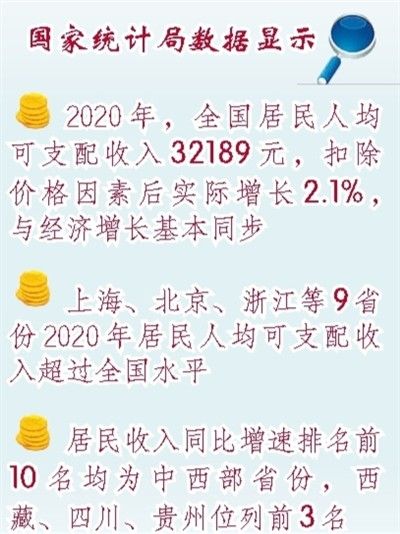 国家统计局公布的数据显示,2020年,全国居民人均可支配收入32189元,名义增长4.7%,扣除价格因素后实际增长2.1%,与经济增长基本同步。居民消费支出稳步恢复,降幅逐季收窄,2020年全国居民人均消费支出达21210元。