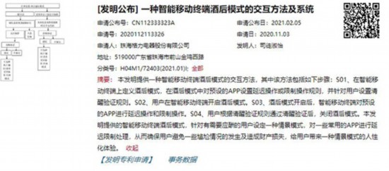 中国网科技2月10日讯 根据国家专利局官网信息显示,格力电器近日公布了一项手机专利技术,名为“一种智能移动终端酒后模式的交互方法及系统”,申请人为珠海格力电器股份有限公司,公开号为CN112333323A。