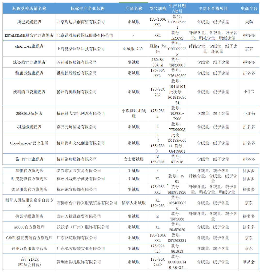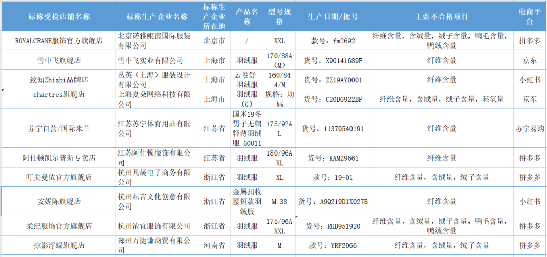 另外,本次抽检中2批次产品鸭毛含量、鸭绒含量项目不合格,包括: