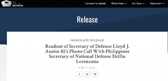 这份通话纪要称,奥斯汀部长确认了美国致力于美菲军事同盟关系以及对美菲《共同防御条约》以及访问部队协议的承诺,并强调了这一协议给两国带来的重要价值。