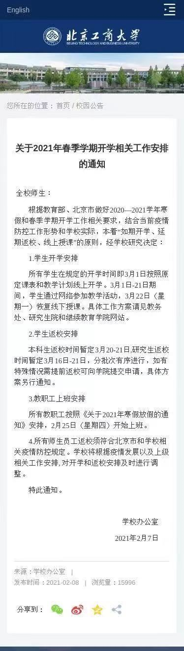 2020年12月17日,北京工商大学曾在官微发布《关于2021年元旦和寒假放假的通知》,规定学生新学期2月28日报到,3月1日开始上课。