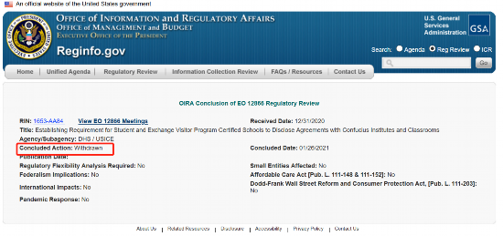 美国“daily caller”新闻网站9日报道称,拜登政府“悄悄”撤回特朗普政府时期的一项有关孔子学院的提案,该提案要求美国的学校及大学披露其与孔子学院的合作关系。从白宫信息和监管事务办公室(OIRA)官网可以发现,该提案已于1月26日被撤回。