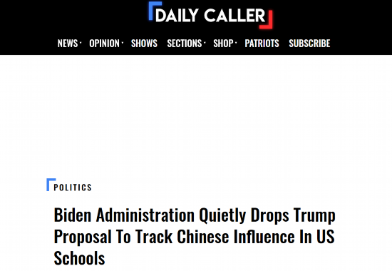“daily caller”网站说,去年12月31日,特朗普政府向国土安全部提交了该提案并试图推行,要求美国大学及K-12学校披露与孔子学院的相关财务关系。但拜登承诺上台后,审查并可能废除特朗普时期特别是与移民问题有关的行政命令。