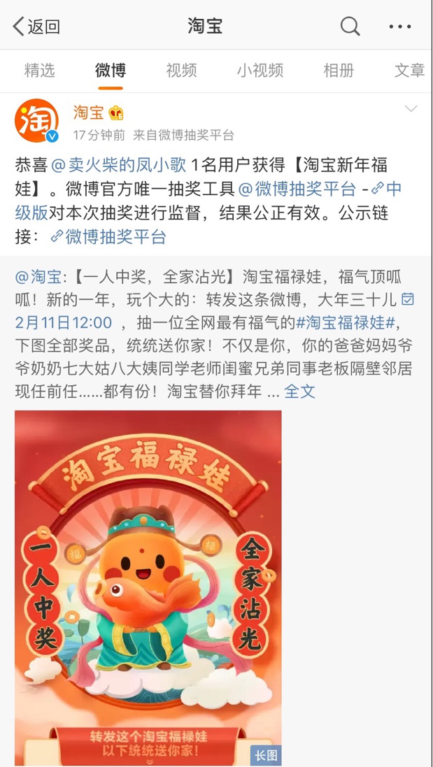 荔枝新闻讯 大年三十中午12点,淘宝春节氛围组最大项目「淘宝福禄娃」正式开奖,来自江苏网友“卖火柴的凤小歌”被200万分之一概率的好运砸中,成为牛年第一锦鲤。