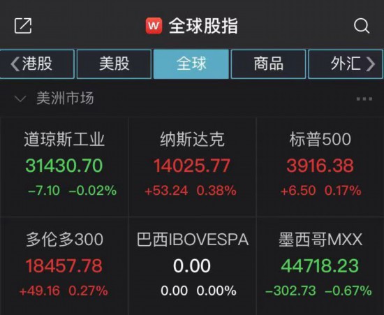 截至收盘,道指跌7.1点,报31430.70点,跌幅为0.02%;纳指涨53.24点,报14025.77点,涨幅为0.38%;标普500指数涨6.5点,报3916.38点,涨幅为0.17%。
