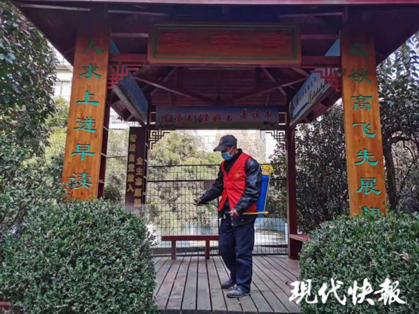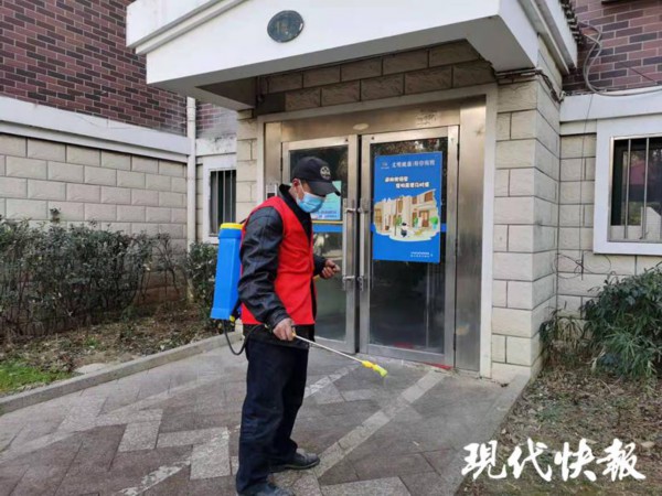 2 月 8 日中午,在连云港市海州区新浦街道站北社区的利华城市花园小区内,一个穿着红马甲的老人背着喷雾器,正在仔细地对小区的楼道以及读书亭等公共场所进行消杀。