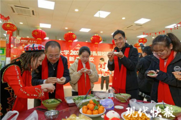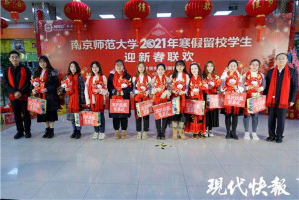 " 同学们过年好,祝大家新春快乐。"2 月 11 日中午,南京师范大学仙林校区新北学生食堂内暖意融融、热闹非凡。留校过年的本科生与校领导、老师欢聚一堂,欢度新春佳节。联欢会上,师生们一起包饺子、唠家常、聊成长,玩起了击鼓传花、抢凳子等趣味游戏,大家一起表演文艺节目、抽取神秘礼盒,欢笑声不断。" 没想到留校过年会,有这么多惊喜。学校的安排让大家都十分感动,不仅不孤单,而且我觉得很有意义。" 吉林小伙王志轩说。