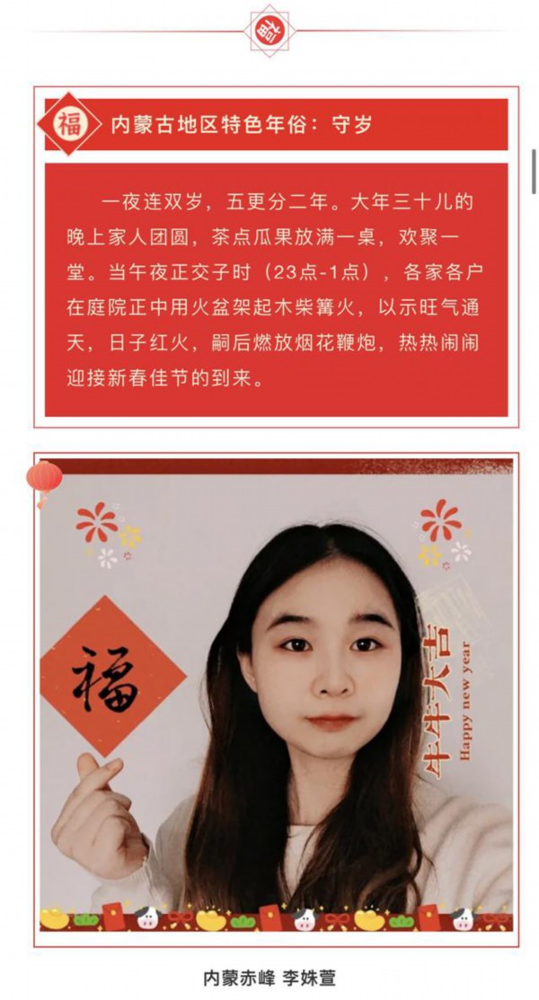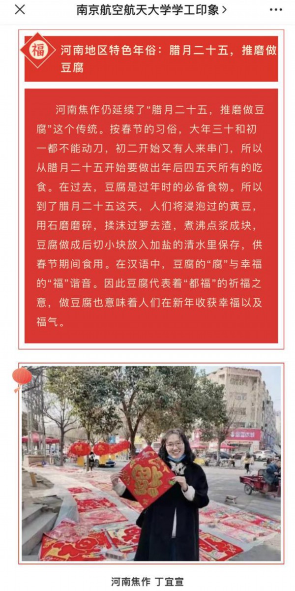 " 农历新春佳节,是中国的百节之首。全国各地都要举行各种庆贺活动,各自带有浓郁的地域特色,今年就跟着南航辅导员们的镜头,一起来看看各地的年味特色吧!" 南航辅导员李瑶说," 我们在各自家乡,给南航学子、老师拜年啦。"