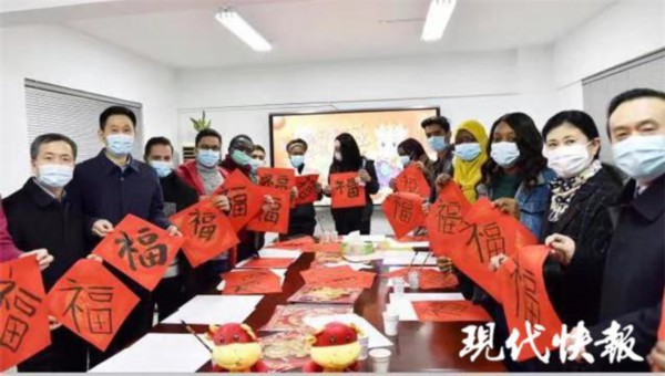 在留学生公寓前,同学们正在开展写福字迎新春活动,体验中国传统文化。寒假期间,南医大两校区有来自全球 35 个国家的 90 名留学生留校。校领导亲切询问了他们的留校生活、学习情况,叮嘱他们如有困难要及时沟通,并感谢同学们对疫情防控工作的积极配合,祝愿他们在学校度过一个祥和美好的中国年。
