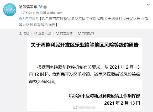 根据国务院联防联控机制有关要求,从2021年2月13日12时起,将利民开发区乐业镇、道里区抚顺街道风险等级调整为低风险。