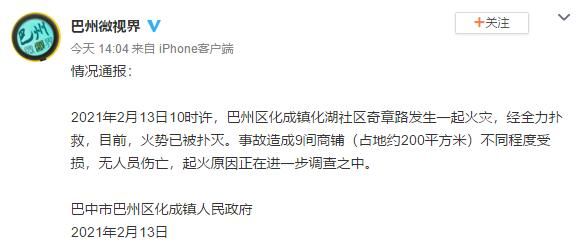 2021年2月13日10时许,巴州区化成镇化湖社区奇章路发生一起火灾,经全力扑救,目前,火势已被扑灭。事故造成9间商铺(占地约200平方米)不同程度受损,无人员伤亡,起火原因正在进一步调查之中。