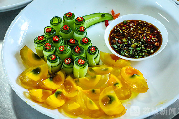 晶莹透亮的咸鸭蛋,鲜脆可口的黄瓜卷,再点缀上红辣椒,外形酷似孔雀,色香味形俱全。