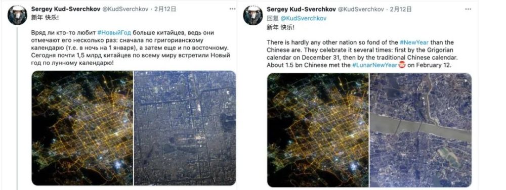 驻留在“国际空间站”上的俄罗斯航天员谢尔盖·库德·斯维奇科夫中国农历大年初一(2月12日)那天在太空中借助推特用中文向中国人拜年,并附上在太空中拍摄的北京和武汉市的照片“介绍”称,几乎没有其他任何一个国家的人像中国人这样喜爱过新年了。