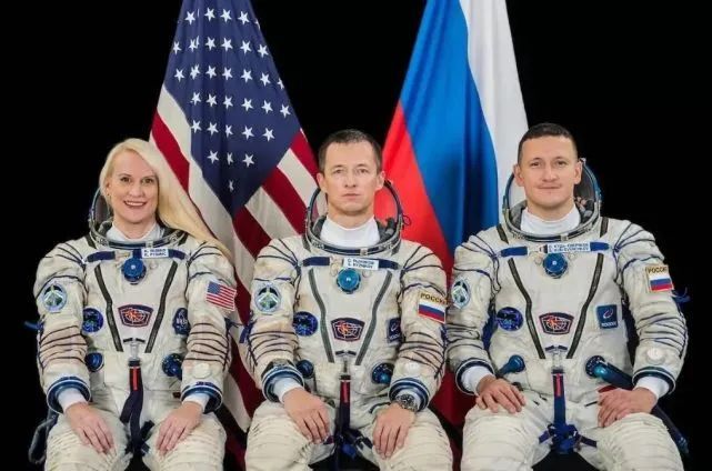 ↑搭乘联盟MS-17的3名航天员(凯瑟琳·鲁宾、谢尔盖·雷日科夫、谢尔盖·库德·斯维奇科夫)