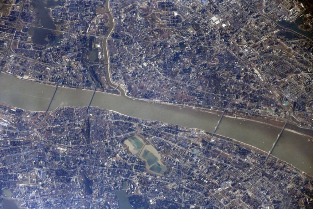 而在武汉市的太空航拍图上,能够清晰地看到武汉市两江三镇的布局和横跨在长江上的四座长江大桥,以及江边的武汉关码头、武汉第一高楼绿地中心。城市建筑鳞次栉比,城市建设生机勃勃。
