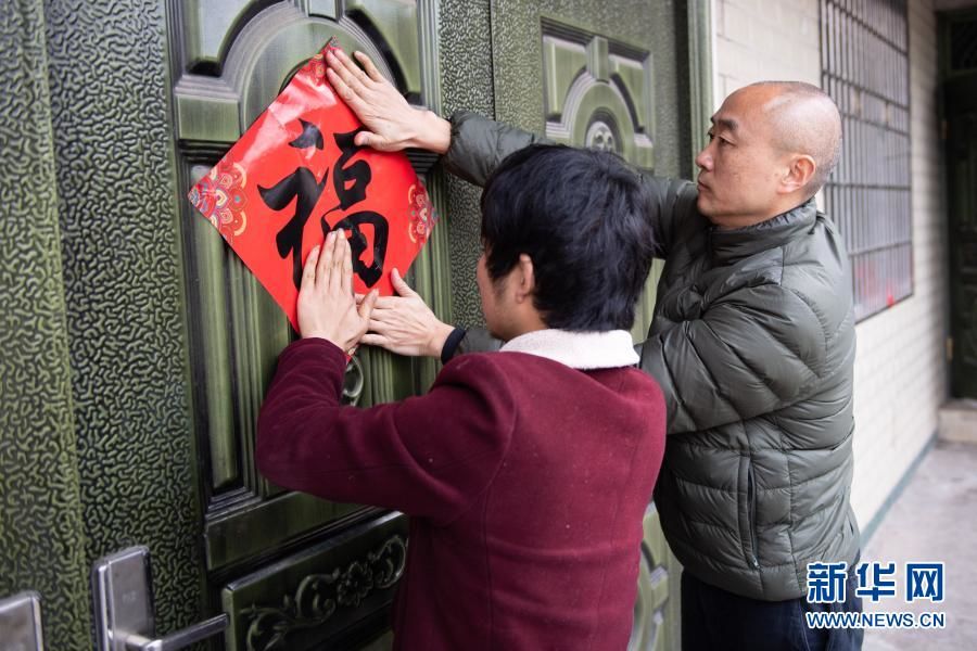 在湖南省湘西土家族苗族自治州永顺县石堤镇团结村,村民李明友(左)和扶贫干部一起贴福字(2月6日摄)。新华社记者 陈思汗 摄