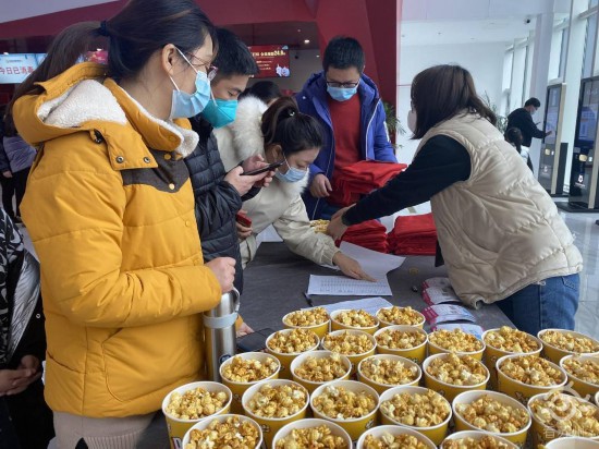 在电影院入口处,工作人员正在为职工门发放红围巾和爆米花,香气四溢,为喜庆氛围增添了一点甜。