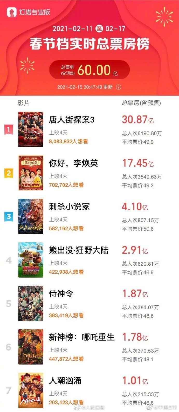 春节假期还有两天,春节档总票房超60亿,刷新了春节档新纪录。电影市场火爆程度的令人惊叹同时,今年偏高的电影票价也令不少人不解。