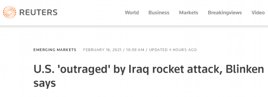 【环球网报道】当地时间2月15日,以美国为首的联军在伊拉克北部的军事基地附近遭遇数枚火箭弹袭击,造成一平民承包商死亡,以及包括一名美国军人在内的5人受伤。根据路透社最新消息,美国国务卿布林肯就此事发表声明,称美方对此“深感愤怒”。