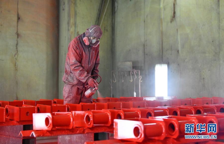2月14日,在中汽(天津)汽车装备公司车间,工人在进行零件喷漆作业。新华社发(孙凡越 摄)
