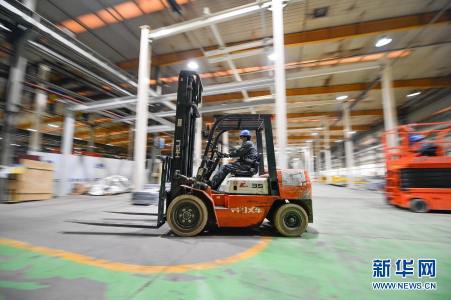 2月14日,在中汽(天津)汽车装备公司车间,工人在操作叉车。新华社发(孙凡越 摄)