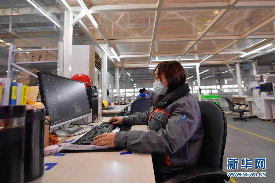 2月14日,在中汽(天津)汽车装备公司车间,工人在为电动汽车生产线配套电路进行线束设计。新华社发(孙凡越 摄)