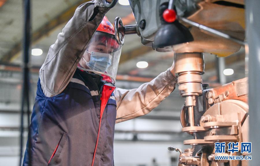 2月14日,在中汽(天津)汽车装备公司车间,工人在为零件进行机器加工。新华社发(孙凡越 摄)