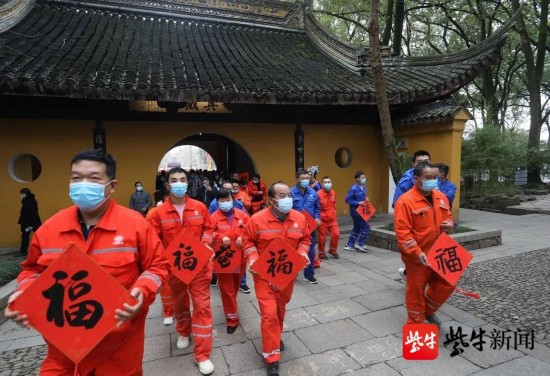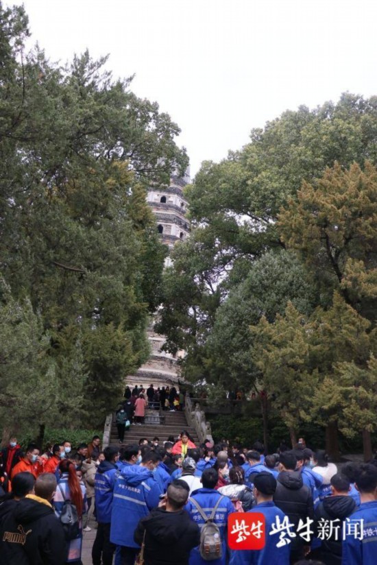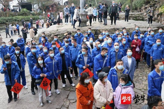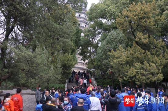 当天上午9时许,120名外地留苏过年的一线工人如约来到虎丘景区。经过安全检查、体温测量等相关流程后,身穿统一的橙、蓝色工作服的工人们,从虎丘景区南门入园,在断梁殿处随“福禄寿”三星“开福门、走福路”,一路上山游园。游览过程中,景区安排了2名专业导游沿途为工人们做详细的讲解介绍。