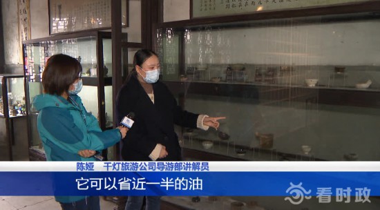千灯旅游公司导游部讲解员陈娅向记者介绍了各个朝代的省油灯,有的省油灯上面放油下面放水,水降低了油的温度,减缓了油挥发的速度,就起到了节油的作用。经过专家的测试,它可以省去一半的油。