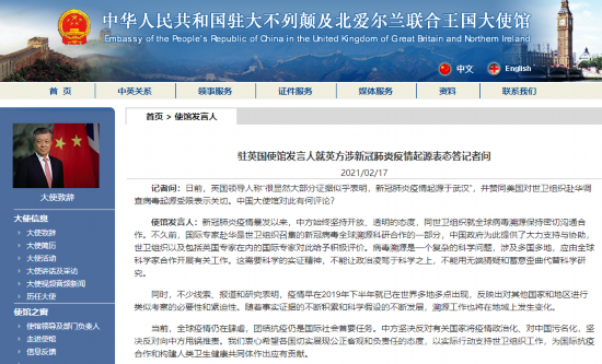 据中国驻英国大使馆网站2月17日消息,驻英国使馆发言人就英方涉新冠肺炎疫情起源表态答记者问。