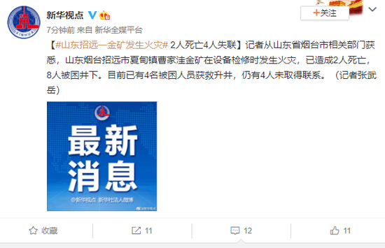 记者从山东省烟台市相关部门获悉,山东烟台招远市夏甸镇曹家洼金矿在设备检修时发生火灾,已造成2人死亡,8人被困井下。目前已有4名被困人员获救升井,仍有4人未取得联系。