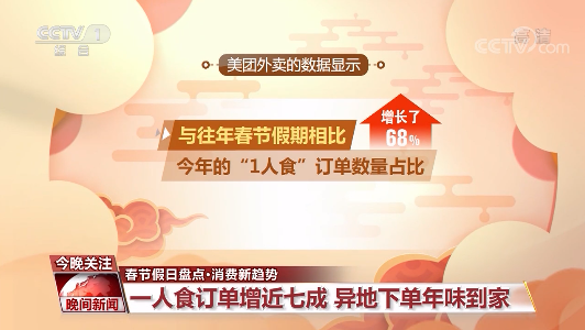 就地过年不回家,年轻人到底咋过春节?美团外卖的数据显示,与往年春节假期相比,今年的“1人食”订单数量占比增长了68%,不少习惯了回家饭来张口的年轻人,开始操持起自己的年味。此外,异地订单增加明显,异地投喂亲友最集中的区域来自广州、深圳、成都、北京和杭州。