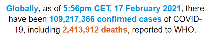 根据世卫组织最新实时统计数据,截至欧洲中部时间2月17日17时56分(北京时间2月18日0时56分),全球累计新冠肺炎确诊病例109217366例,累计死亡病例2413912例。17日全球新冠肺炎确诊病例新增348150例,死亡病例新增8251例。