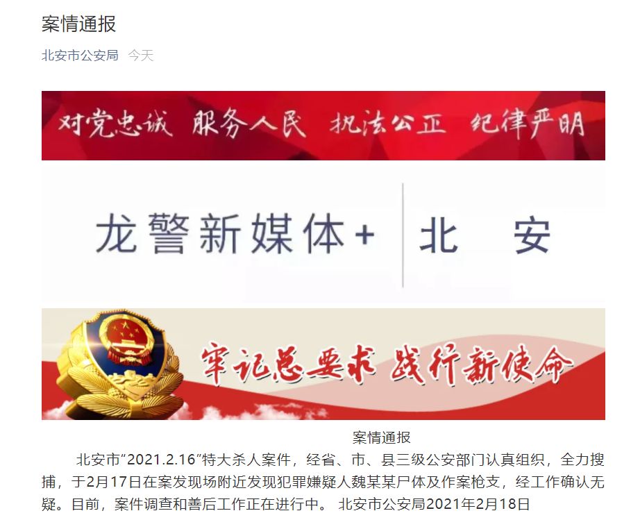 荔枝新闻讯 黑龙江北安市“2021.2.16”特大杀人案件,经省、市、县三级公安部门认真组织,全力搜捕,于2月17日在案发现场附近发现犯罪嫌疑人魏某某尸体及作案枪支,经工作确认无疑。目前,案件调查和善后工作正在进行中。