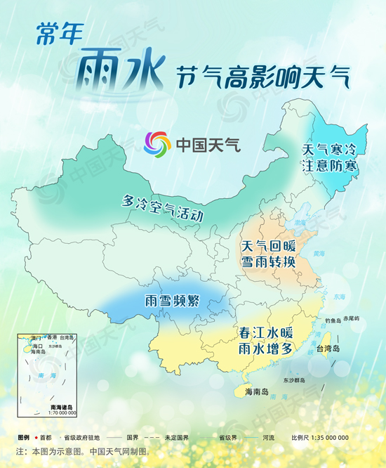 常年雨水节气期间,天气变化不定,气温变化幅度较大,伴随气温的回升,降水也增多,不少地方在雨水节气迎来最后一场雪。从常年高影响天气来看,北方多冷空气活动,像是东北、内蒙古东部等地天气仍旧寒冷,西北地区或有雪,上述地区仍然要注意防寒保暖;同时华北、黄淮一带经历着雨雪转换;而南方气温回升,雨水增多,尤其西南地区雨水频繁,一些高海拔的地区还会有降雪。