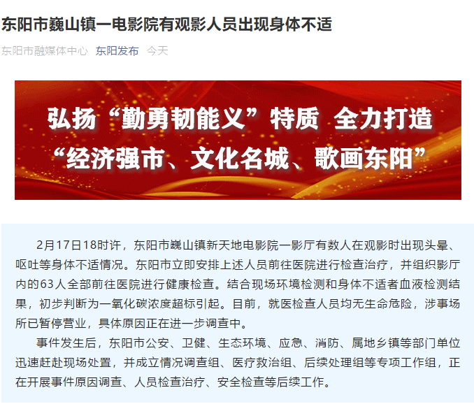 荔枝新闻讯 根据东阳发布微信公众号消息,2月17日18时许,浙江东阳市巍山镇新天地电影院一影厅有数人在观影时出现头晕、呕吐等身体不适情况。东阳市立即安排上述人员前往医院进行检查治疗,并组织影厅内的63人全部前往医院进行健康检查。