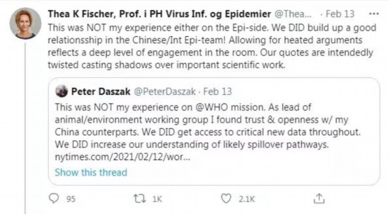 另一名出现在《纽约时报》报道中的世卫专家、丹麦哥本哈根大学教授塞娅·菲舍尔在推特上转发达萨克的推文说:“这也不是我在流行病学小组的经历……我们说的话被故意歪曲,这为重要的科学工作蒙上阴影。”她还表示,要建立信任必须要忠于事实。“请停止这种关于‘无法获得原始数据’的负面说法!”