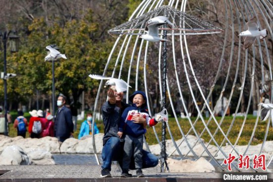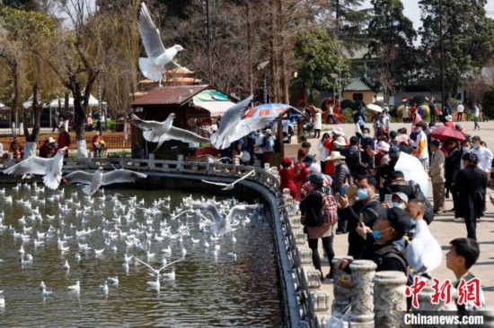 2月16日,游客在云南昆明与红嘴鸥互动。李嘉娴 摄
