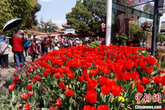 2月16日,游客在云南昆明大观公园与郁金香合影。李嘉娴摄