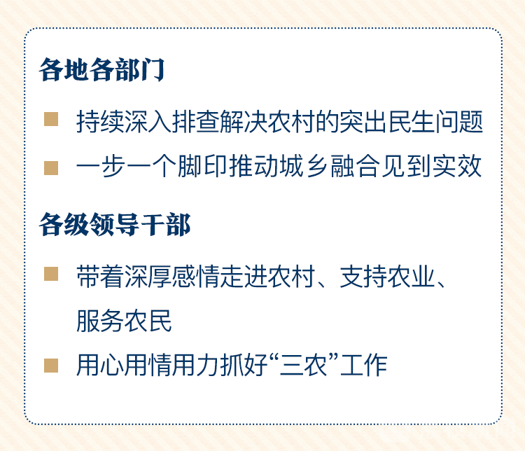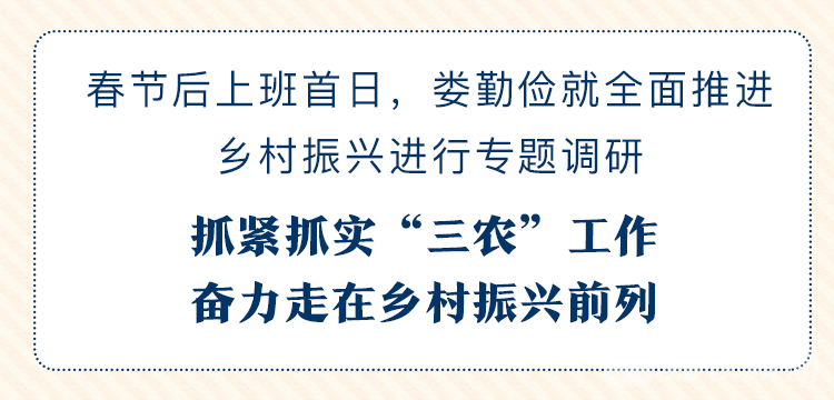 娄勤俭强调,各地各部门要紧紧围绕努力让农民和市民不再有明显身份界限、让城乡生活品质不再有明显落差的目标,发扬淮海战役精神,加强协调联动和联合作战,保持历史耐心,遵循客观规律,稳扎稳打、久久为功,持续深入排查解决农村突出民生问题,一步一个脚印推动城乡融合见到实效。各级领导干部一定要高度重视“三农”工作,带着深厚感情走进农村、支持农业、服务农民,用心用情用力抓好“三农”工作,努力为全省“争当表率、争做示范、走在前列”作出更大贡献。