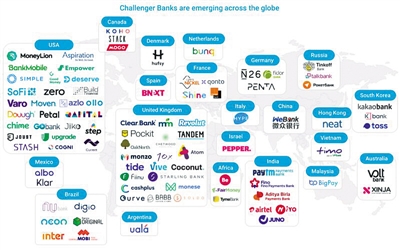 如今,世界各地的新式金融企业使用多种商业模式,当然,其中一些模式会比其他模式更有力,也更能适应时代发展。图为全球新式银行分布图。