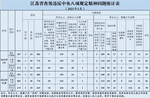 2021年1月,全省共查处违反中央八项规定精神问题507起,处理801人,其中给予党纪政务处分673人。从问题类型看,查处形式主义、官僚主义问题162起、处理264人,查处享乐主义、奢靡之风问题345起、处理537人。从人员级别看,处理市厅级干部1人、县处级干部30人、乡科级及以下人员770人。