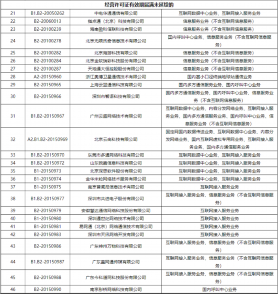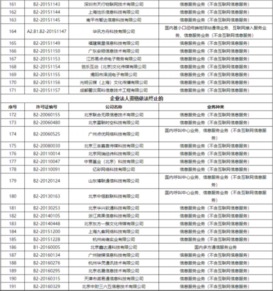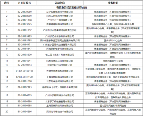 通告显示,近期,辽宁弘昊信息技术有限公司等20家企业向工业和信息化部提交申请,要求注销其持有的跨地区增值电信业务经营许可证,并依据《电信业务经营许可管理办法》(工业和信息化部令第42号)第三十一条第一款规定,提交了相关申请材料。中电华通通信有限公司等151家企业,经营许可证有效期届满,且未在规定期限内向工业和信息化部提出延续经营许可证的申请或不符合许可延续规定。魔匣(上海)信息科技有限公司等212家企业,已被相关市场监督管理机构依法吊销、撤销或者注销营业执照,其企业法人资格依法终止,不具备经营增值电信业务条件。