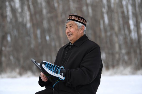 王福林在新疆塔城市快活林冰场小坐,回忆年轻时光(2月10日摄)。