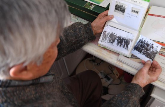 王福林在家里翻看拍摄于1960年的冰球队合影照片(2月10日)。