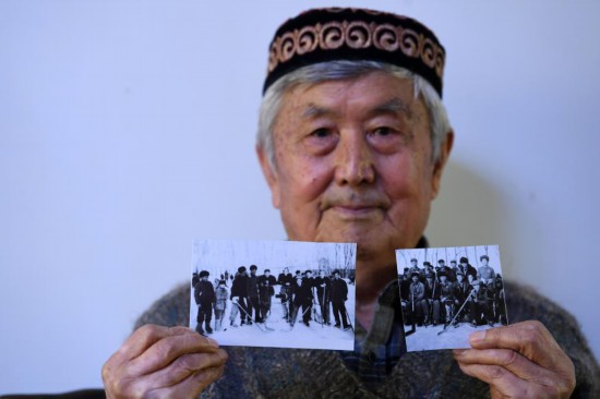 王福林在家中展示拍摄于1960年的冰球队合影照片(2月10日摄)。