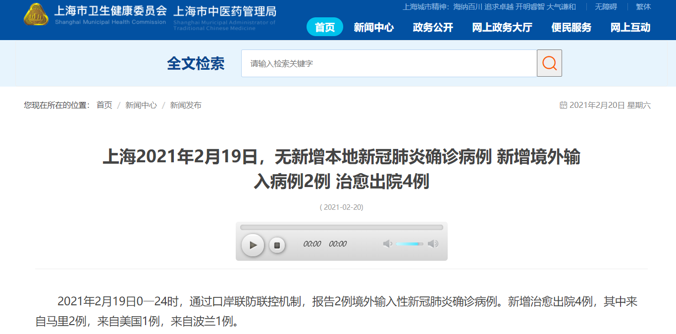 据上海卫健委网站消息,2021年2月19日0—24时,上海市通过口岸联防联控机制,报告2例境外输入性新冠肺炎确诊病例。新增治愈出院4例,其中来自马里2例,来自美国1例,来自波兰1例。