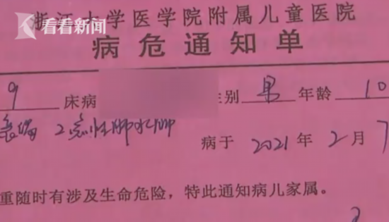 江女士说,当时医生说人没事,只是需要转院,之后就坐救护车和孩子一起转院。在这期间,孩子一直处于昏迷状态,她感到十分奇怪,为什么孩子已经没事了,却还是昏迷不醒?120救护车以最快的速度抵达另一所医院,刚到医院,江女士就收到医院下发的病危通知单,上面写着:病人因患急性呼吸衰竭、急性肺水肿等,目前病情危重,随时有涉及生命危险,特此通知病儿家属。然后,孩子就被转入重症监护室,直到2月13日,江女士的儿子才转出。