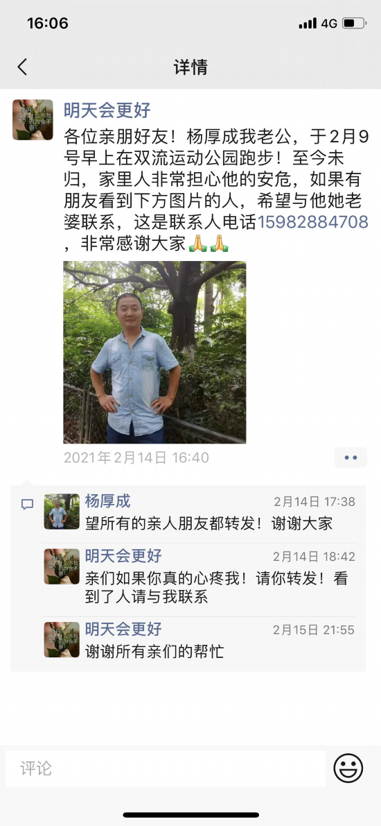 2月9日早上,距离除夕还有两天,48岁的杨厚成出门锻炼后再未归家,至今已失联11天。