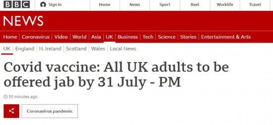 “在7月31日前向英国所有成年人提供新冠疫苗”,英国广播公司(BBC)2月21日援引英国首相鲍里斯·约翰逊的表态报道称,约翰逊承诺,2021年7月底之前,政府将可以向英国所有成年人提供第一剂新冠疫苗。